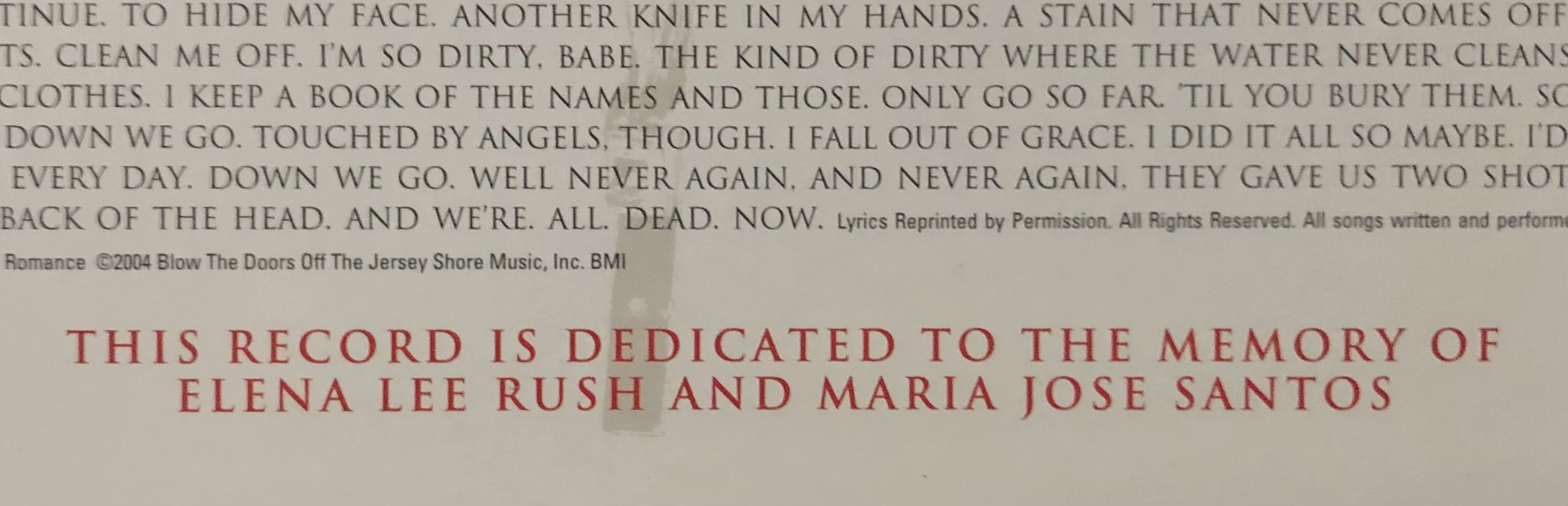 Following Elena's death, Gerard wrote the song "Helena," which combined Elena's name and her nickname, Helen. One the concurrent release of Three Cheers for Sweet Revenge, they dedicated the album in part to her, which can be seen on the liner notes.